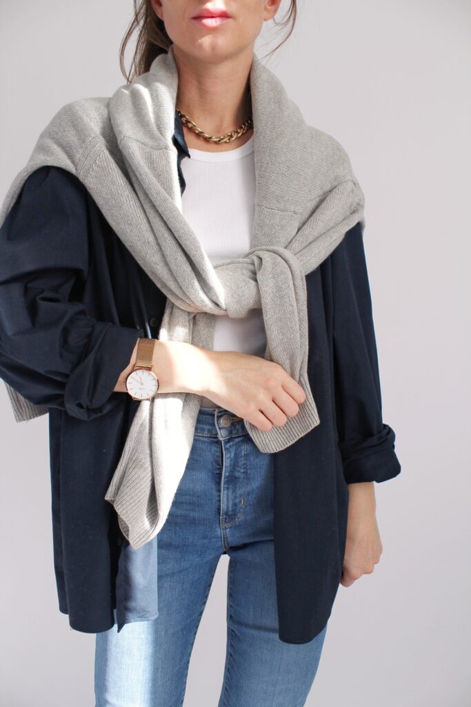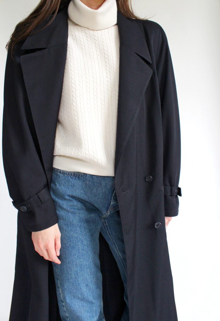 Trencz z wełny, golf z wełny merynosa, jeansy vintage