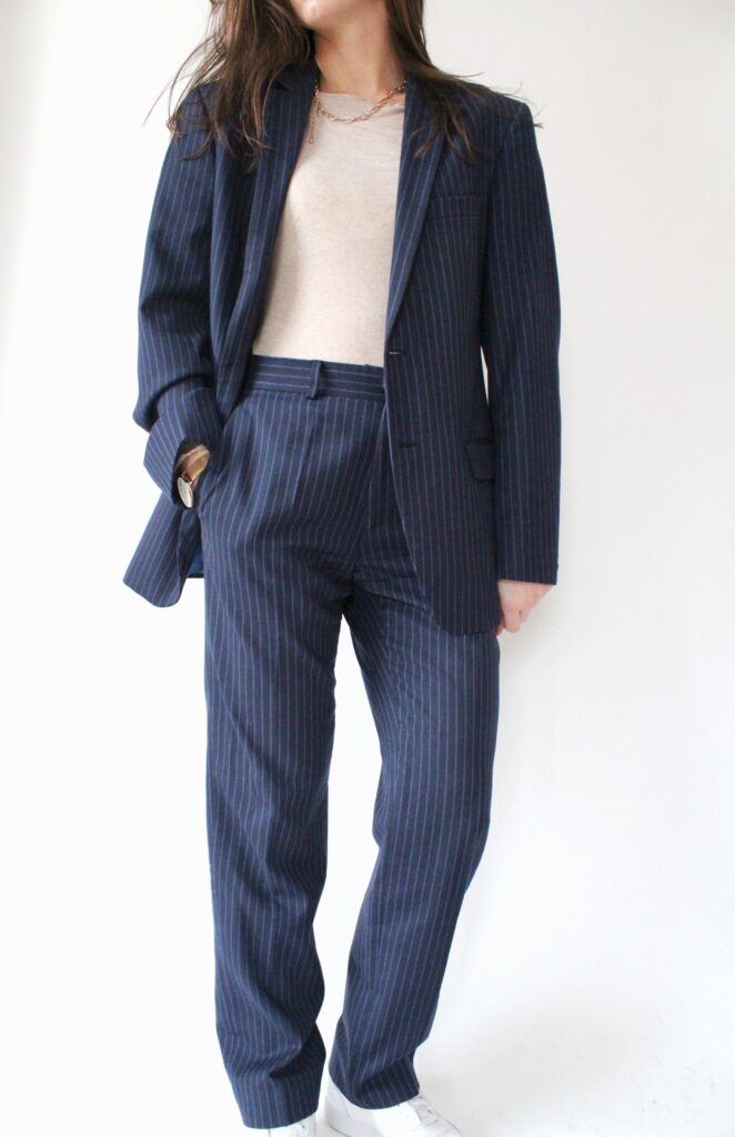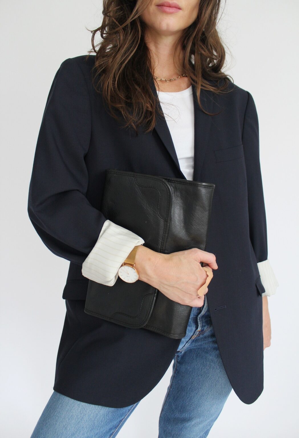 Wełniana marynarka firmy Tiger of Sweden, jeansy Levis, skórzana kopertówka vintage