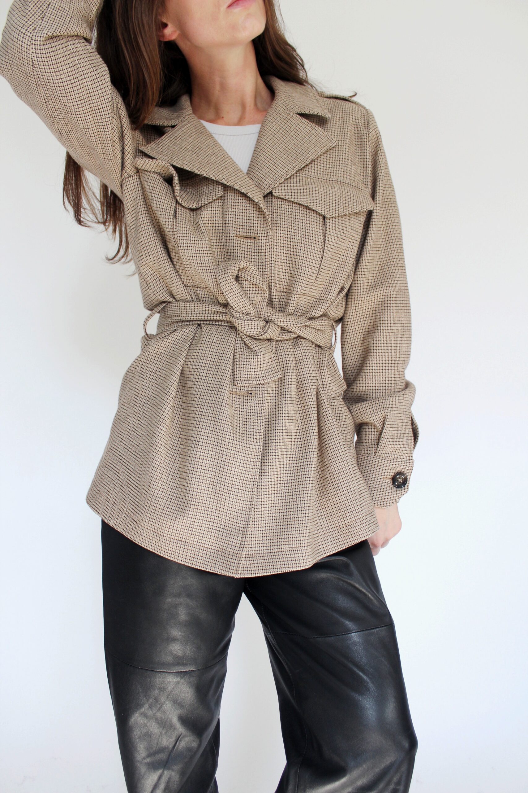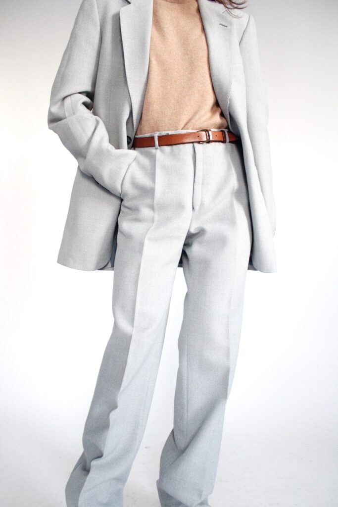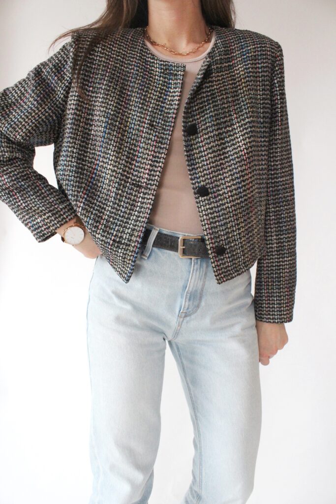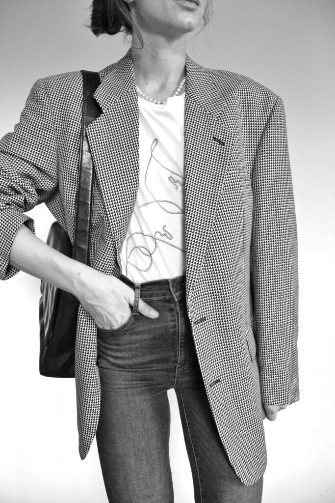Żakiet z jedwabiu, bawełniany top, jeansy Lee, skórzany pasek vintage