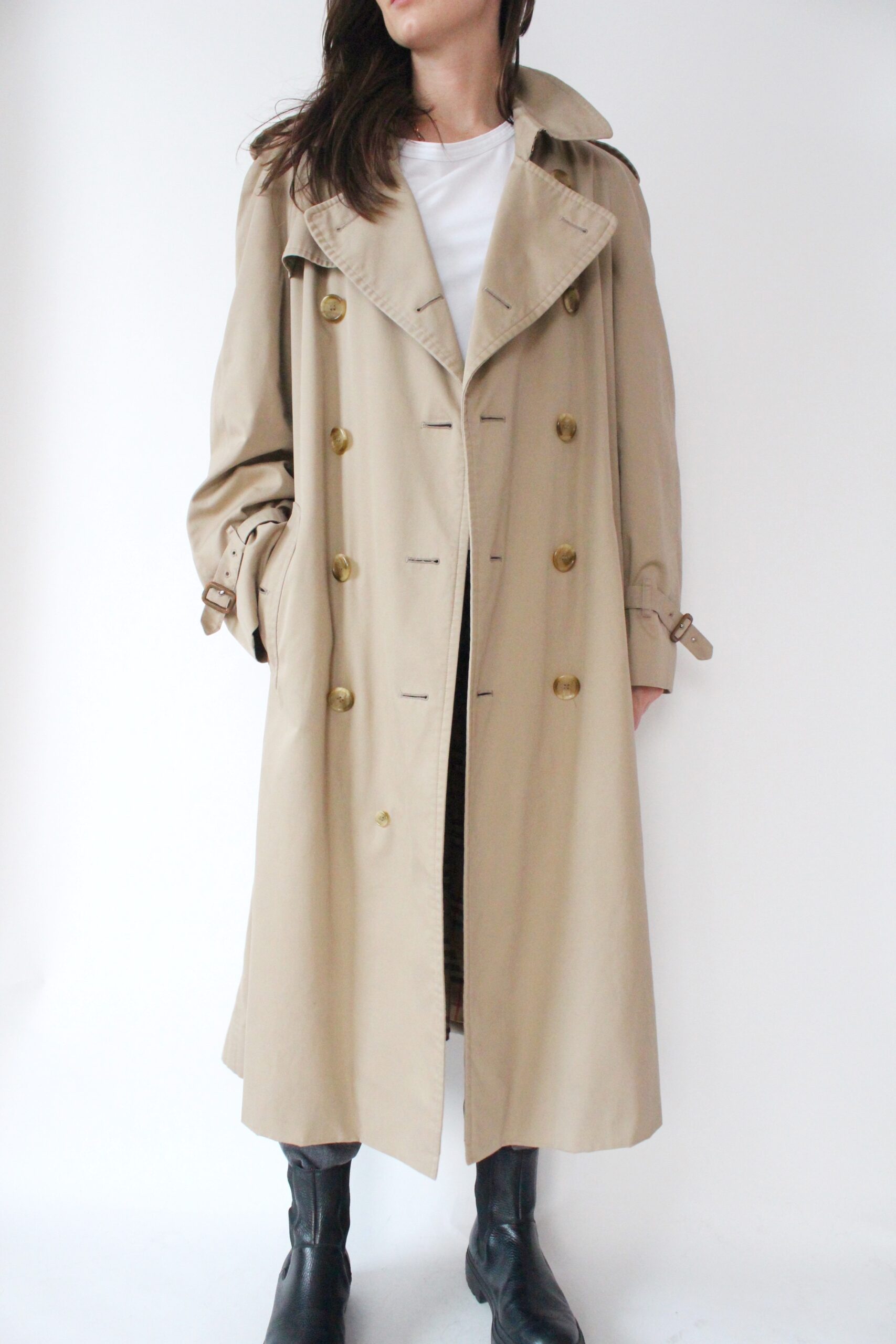 Trencz Burberry vintage, spodnie Monki model Kimomo, skórzane buty Ryłko