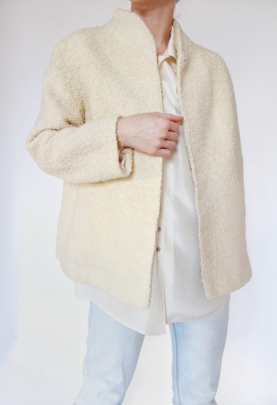 Jedwabna koszula, żakiet z wełny typu bouclé, jeansy Lee